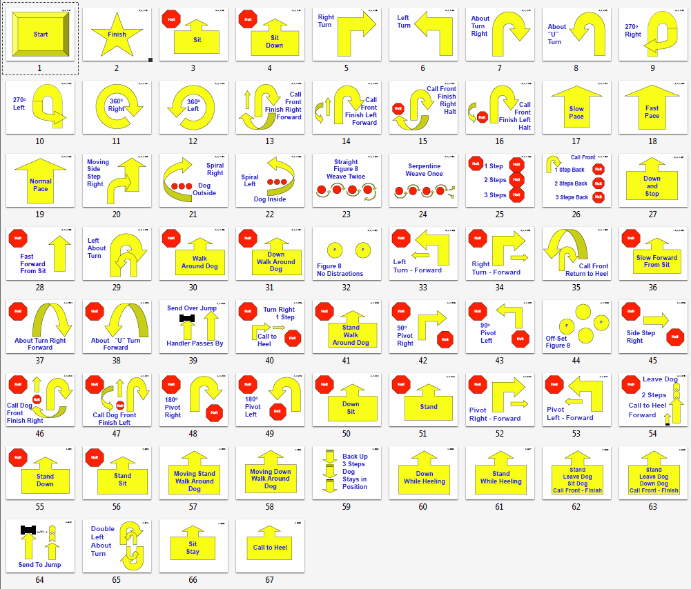 Many of the behaviors required are basic obedience commands. The competitors walk a course of 10 to 20 “stations.” Stations are indicated by signs(Click Here) telling the dog and handler team what to do. Each team starts with 100 points and the judge deducts points for any mistakes.